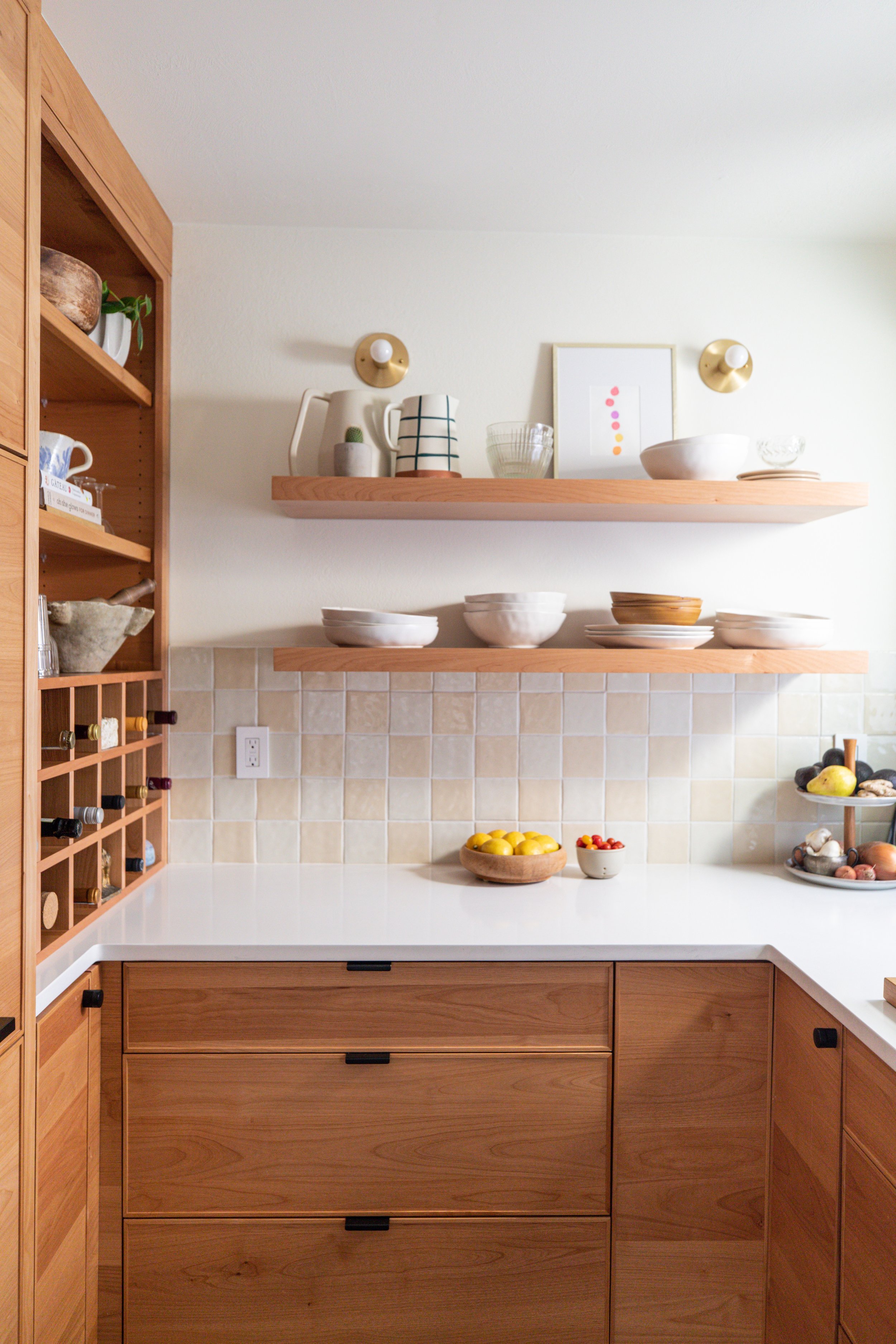 KITCHEN: Clear Alder, Natural Clear Coat, Horizontal Grain+ Painted Maple Cloud White Custom Hood Cabinet